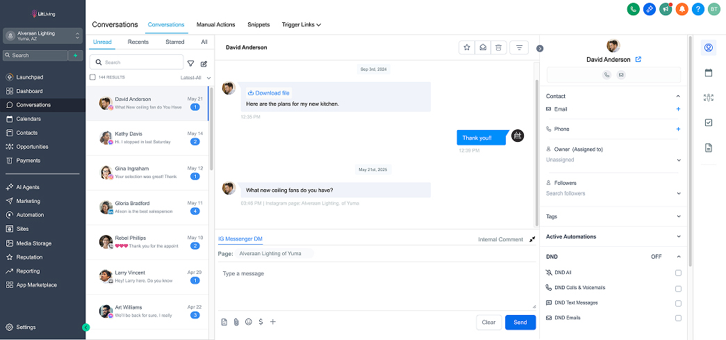 From here you can view and respond to messages from all over the place, including Instagram, Facebook, Google, website forms, and even missed calls and text messages.